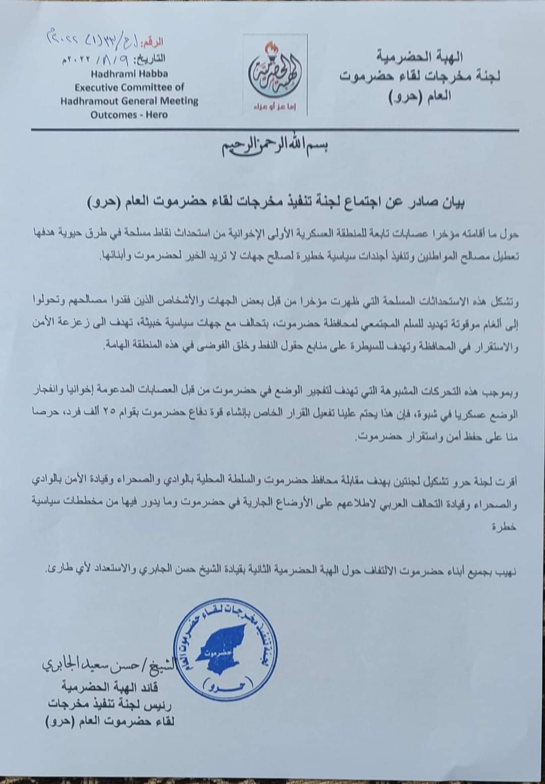 وكشف بيان صادر، اليوم الثلاثاء، عن اجتماع لجنة تنفيذ مخرجات لقاء حضرموت العام (حرو)، وهو ما يعرف بالهبة الحضرمية، عن استحداث من وصفهم بـ “عصابات المنطقة العسكرية الأولى الإخوانية” نقاط مسلحة في طرق حيوية بوادي وصحراء حضرموت.