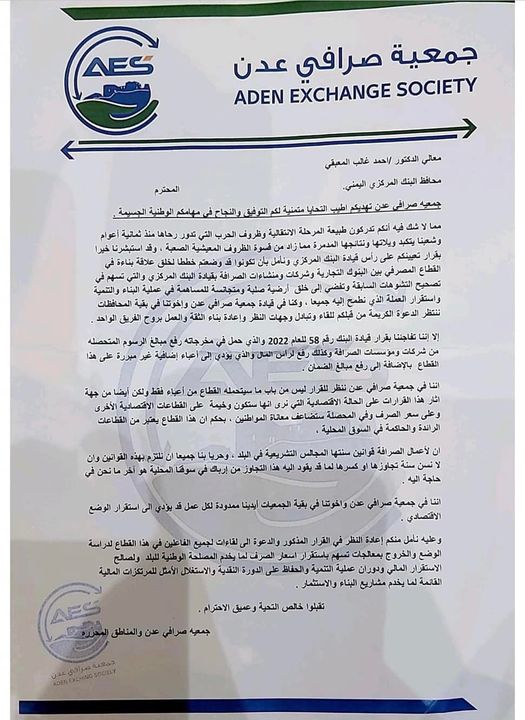 وأضاف: “إننا في جمعية صرافي عدن، ننظر للقرار ليس من باب ما سيتحمله القطاع من أعباء فقط. ولكن أيضا من جهة آثاره على الحالة الاقتصادية التي نرى أنها ستكون وخيمة على القطاعات الاقتصادية الأخرى وعلى سعر صرف العملة”.