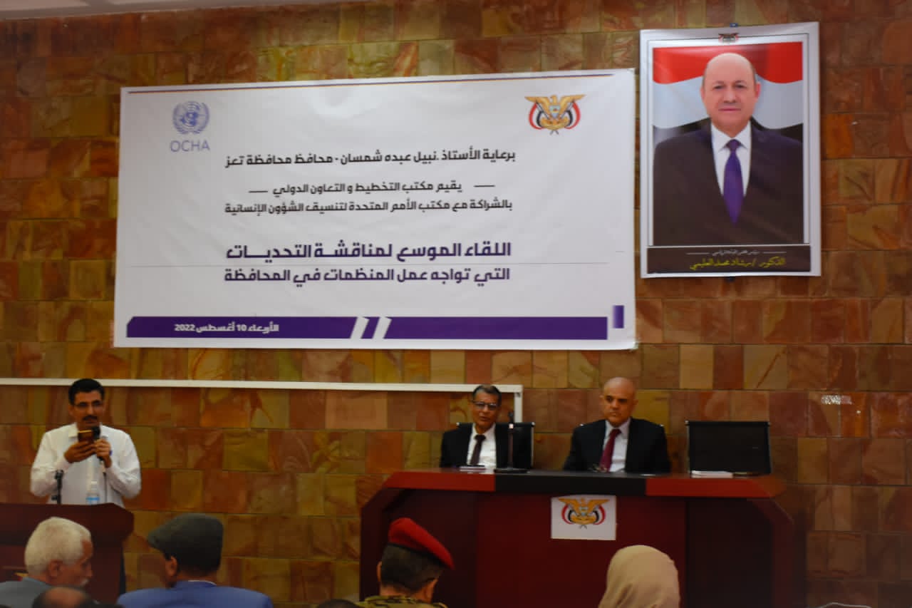 عقد محافظ محافظة تعز نبيل شمسان اليوم الأربعاء لقاءا موسعا بحضور ممثلين عن مكتب الأمم المتحدة لتنسيق الشؤون الإنسانية ورؤساء عدد من الكتل والمنظمات الدولية لمناقشة أهم التحديات التي تواجه العمل الإنساني في المحافظة.