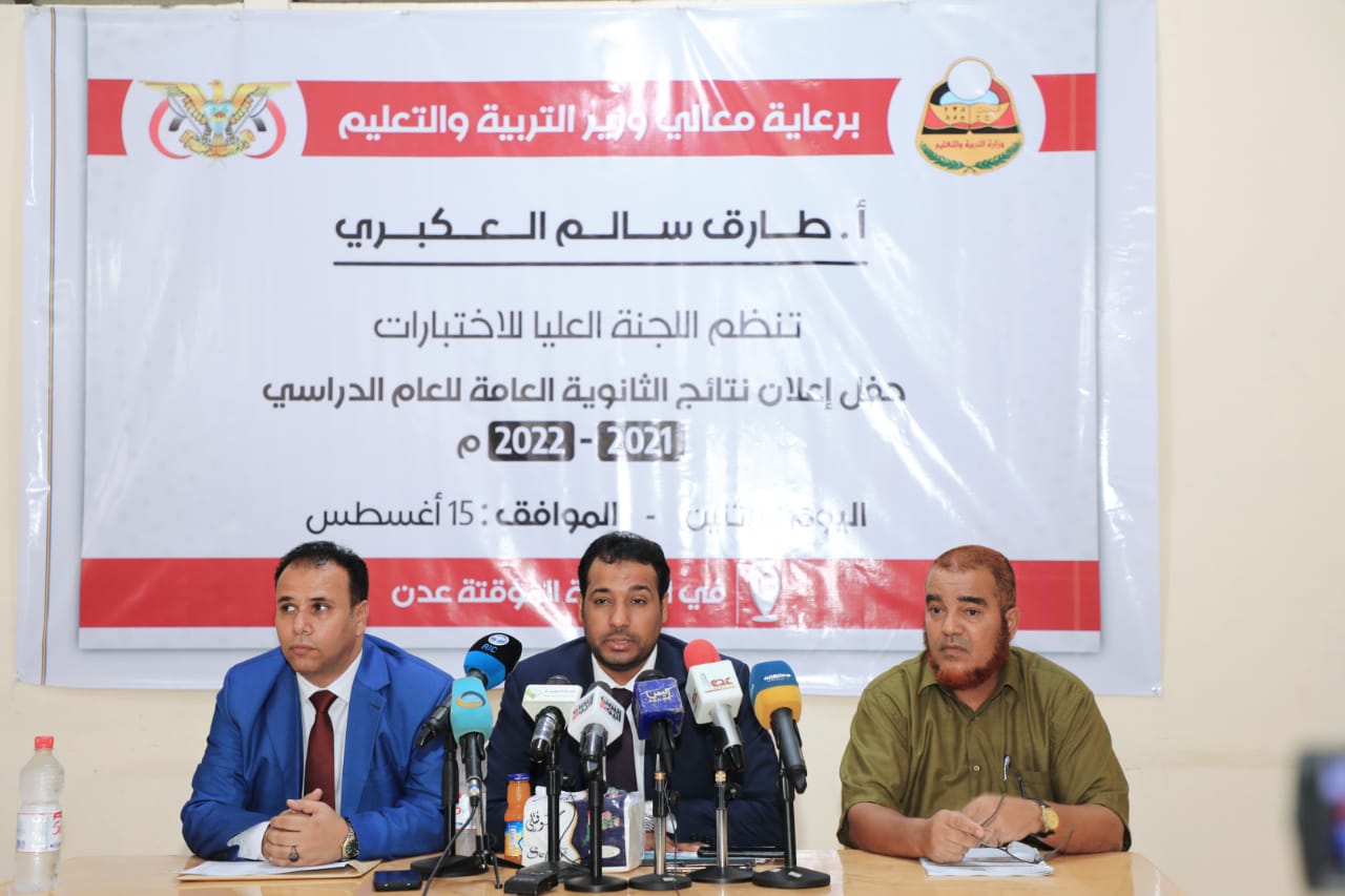 أعلنت وزارة التربية والتعليم، في العاصمة عدن، اليوم الاثنين، بالعاصمة المؤقتة عدن، نتائج اختبارات شهادة الثانوية العامة بقسميها العلمي والأدبي للعام الدراسي 2022/2021، وأسماء الأوائل في القسمين.