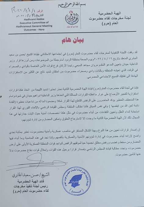 وأوضح البيان، أن اتخاذ مثل هذا القرار “استفزازيا”، ويهدف إلى تفجير الأوضاع في حضرموت، على غرار ما نتج عن قرار وزير الداخلية المماثل في شبوة. الذي ألغى قرار المحافظ العولقي بإقالة قائد قوات الأمن الخاصة.