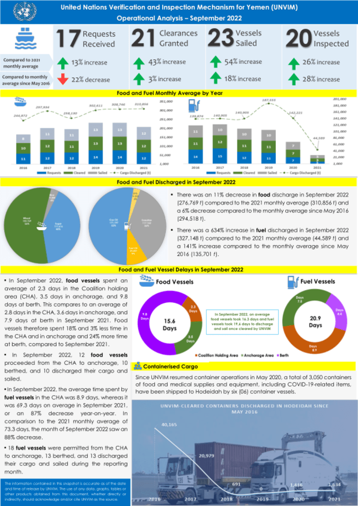 وأوضح التقرير التشغيلي لشهر سبتمبر 2022، أن الآلية الأممية، منحت خلال الفترة ذاتها، تصاريح دخول لـ 12 سفينة تحمل مواد غذائية من منطقة احتجاز التحالف العربي إلى موانئ الحديدة. وأن عشر سفن منها رست وأفرغت حمولتها وغادرت.