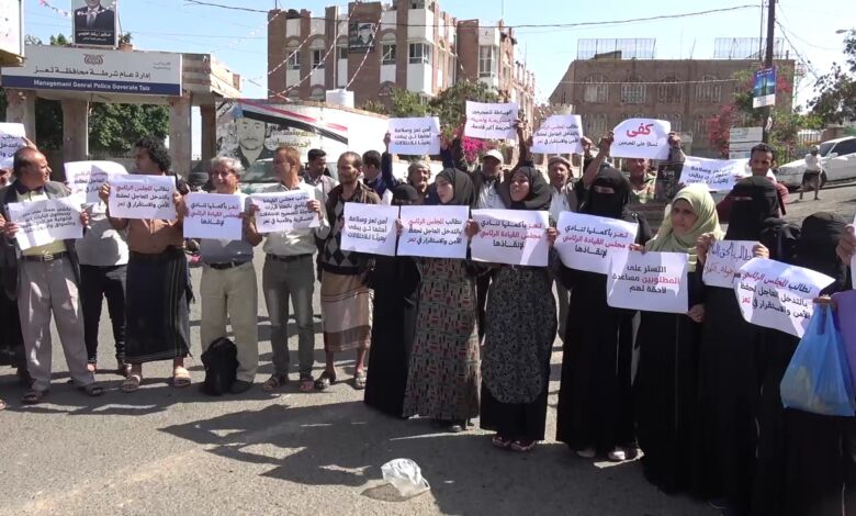 وقفة احتجاجية في تعز تطالب مجلس القيادة الرئاسي بسرعة تصحيح الاختلالات في المؤسستين العسكرية والأمنية
